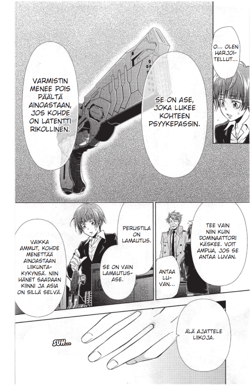 Kannattaako tätä lukea jos on jo katsonut animen ja tietää mitä siinä tapahtuu? Kyllä ja ei, sanoisin. Tämän ollessa suomeksi, se on ainoa tapa nauttia Psycho-Pass -sarjasta jos englanti ei ole katsojalle vahvin kieli. Suosittelen tätä varsinkin niille, joille anime ei ole ennestään tuttu ja haluaa lukea kuinka Akanen ja Kogamin seikkailut oikein jatkuvat. Myös rikosmangaa odottaneille tämä on suositeltava, sillä suomeksi sellaista ei ole ollut oikein saatavilla sitten Salapoliisi Conanin suomenkielisen kääntämisen lopettamisen.